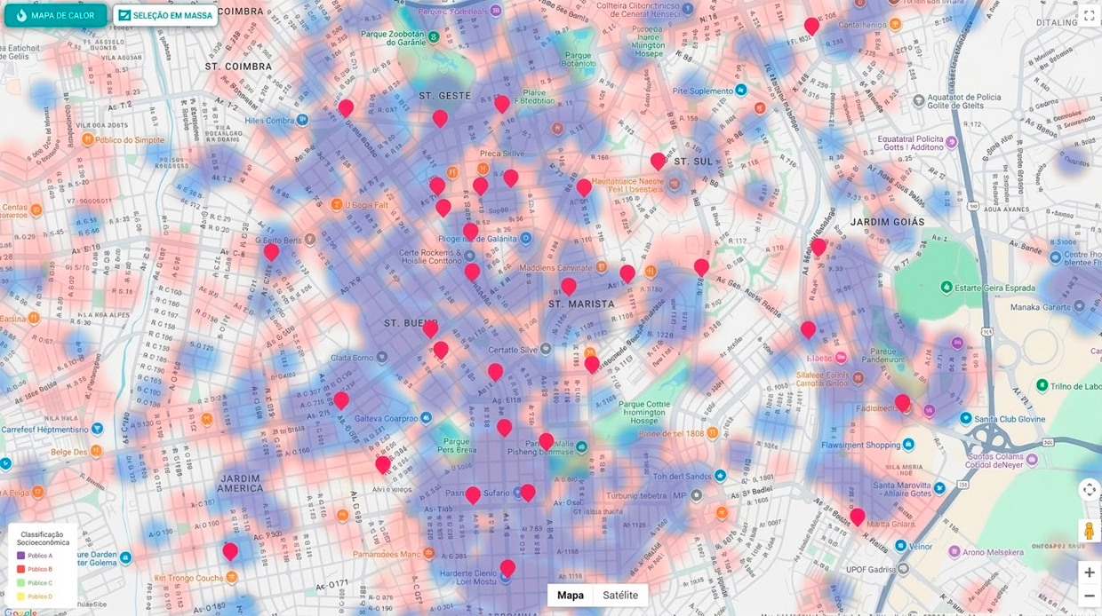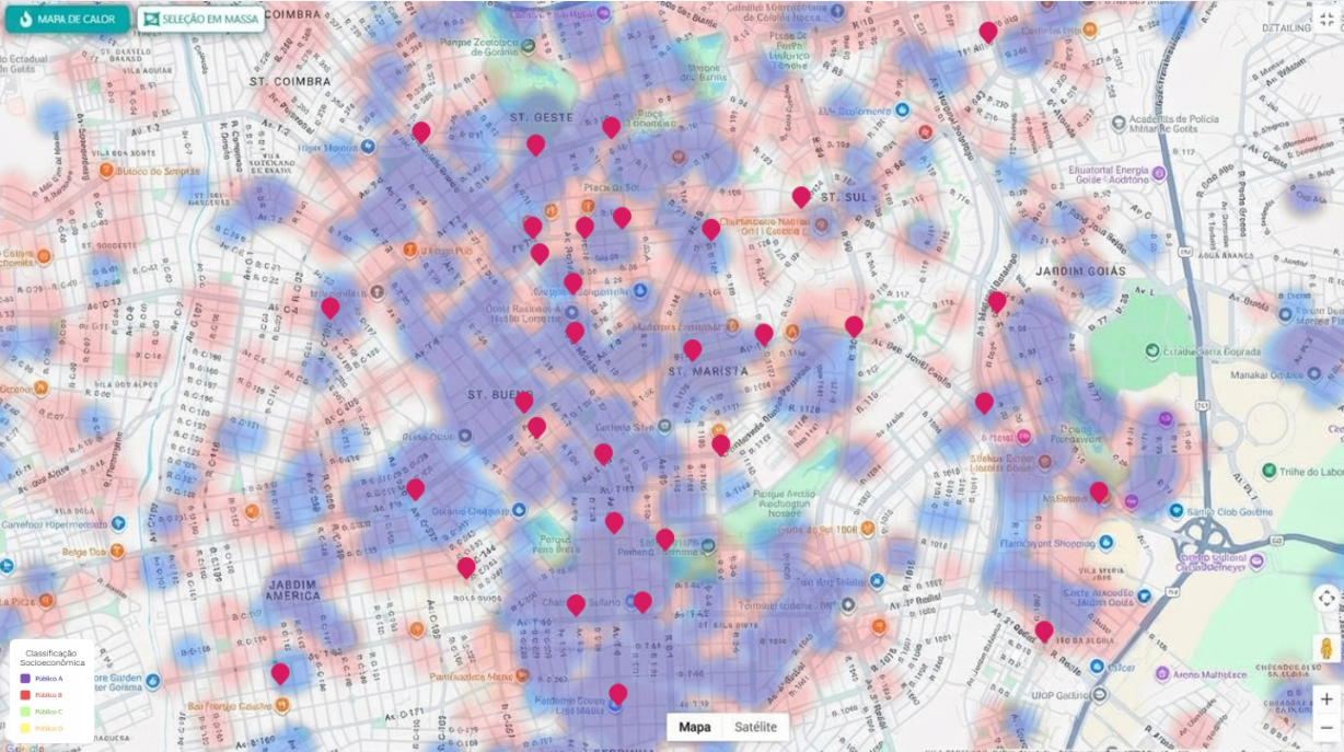 Nosso mapa de calor identifica, com precisão geográfica, o perfil sócio econômico do público, na micro região onde estão os painéis publicitários.