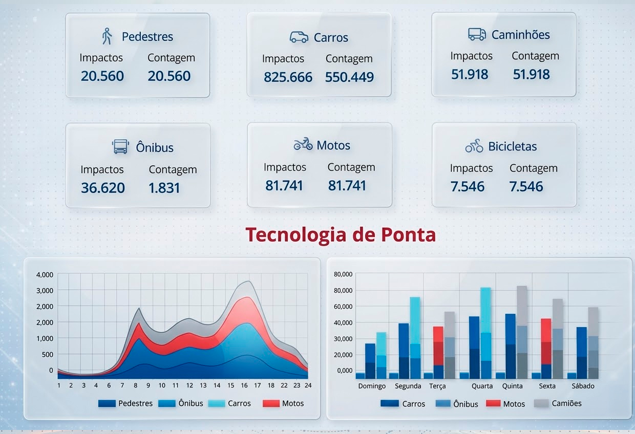 A RBOOH utiliza tecnologia avançada para mapear impacto real por tipo de fluxo: pedestres, carros, ônibus, motos, bicicletas e caminhões.
